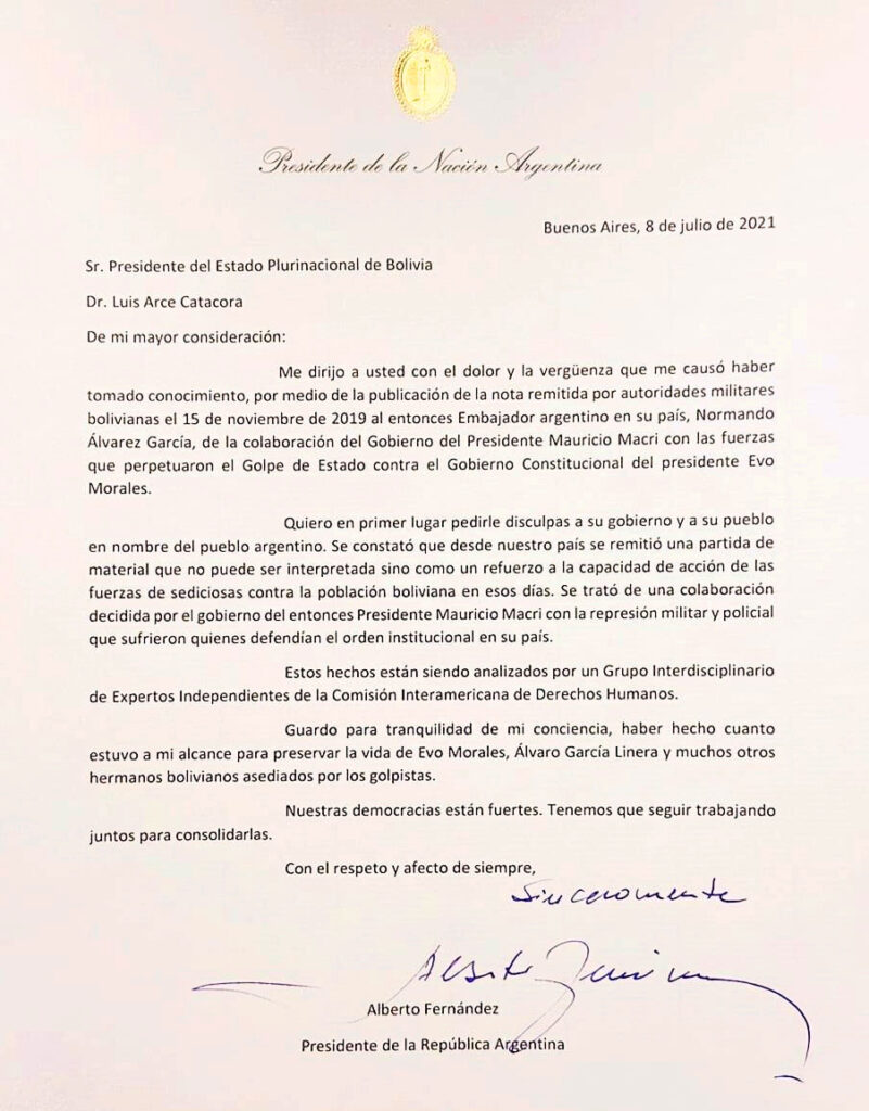 El presidente argentino, Alberto Fernández, mediante una carta enviada a su homólogo, Luis Arce, pidió disculpas en nombre de su país, luego de conocer la noticia de la participación del gobierno del exmandatario Mauricio Macri en el supuesto ‘golpe de Estado’ en Bolivia, en noviembre de 2019.