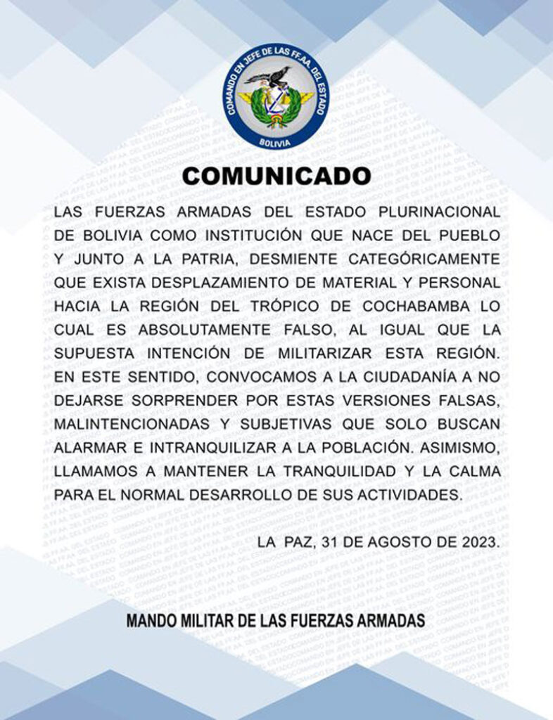 “Las Fuerzas Armadas del Estado Plurinacional de Bolivia como institución que nace del pueblo y junto a la patria, desmiente categóricamente que exista desplazamiento de material y personal hacia la región del trópico de Cochabamba lo cual es absolutamente falso”, señala un comunicado oficial.