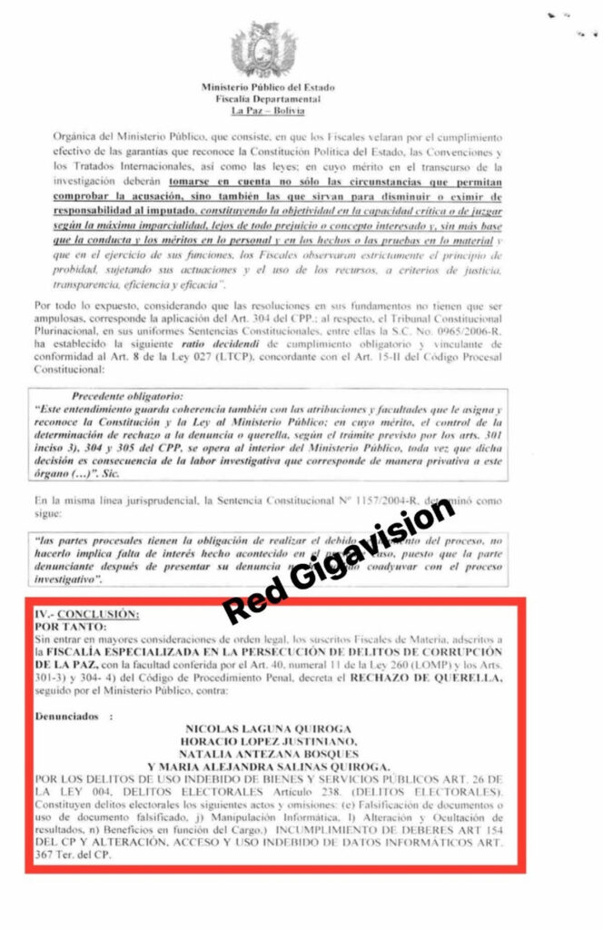 “Sin entrar en mayores consideraciones de orden legal, los adscritos fiscales de materia adscritos a la Fiscaliza Especializada en la Persecuión de Delitos de Corrupción de La Paz, con la facultad conferida (…) decreta el Rechazo de querella seguido por el Ministerio Público”, señala el documento.