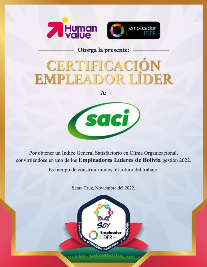 Con un índice de satisfacción del 82,8%, SACI es premiado como Empleador Líder 2022. Entre las razones para lograr este puntaje destacando están que los colaboradores son beneficiados en distintos campos como ser; educación y desarrollo profesional; salud y bienestar; y apoyo familiar. Esta medición fue realizada a través de encuestas por la consultora Human Value y reafirma la vocación hacia el buen ambiente laboral que tiene la empresa multisectorial y multimarca.
