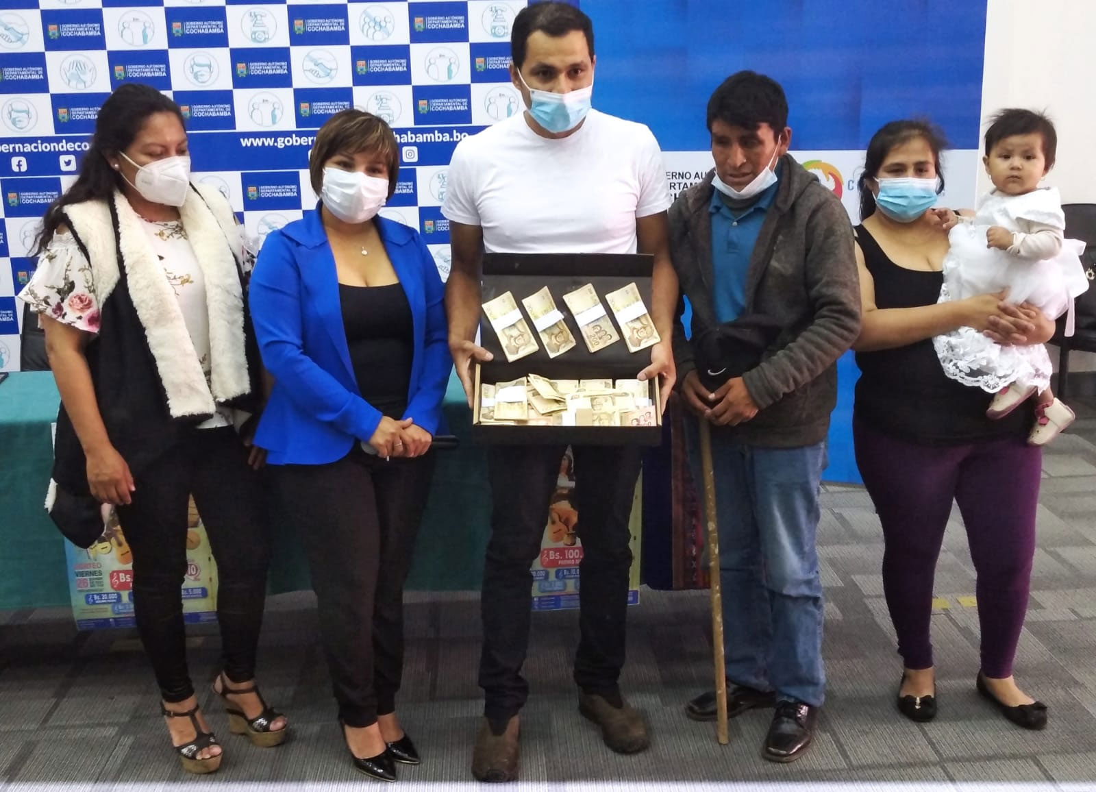 Cristian Jansasoy y su esposa, María Zamora, de la ciudad de Cochabamba, ganadores de Bs 100.000 del sorteo nacional de la Lotería Nacional, denominado “Mujer Te quiero Libre”, compartieron parte de su premio con su vecino de escasos recursos que es una persona con discapacidad.