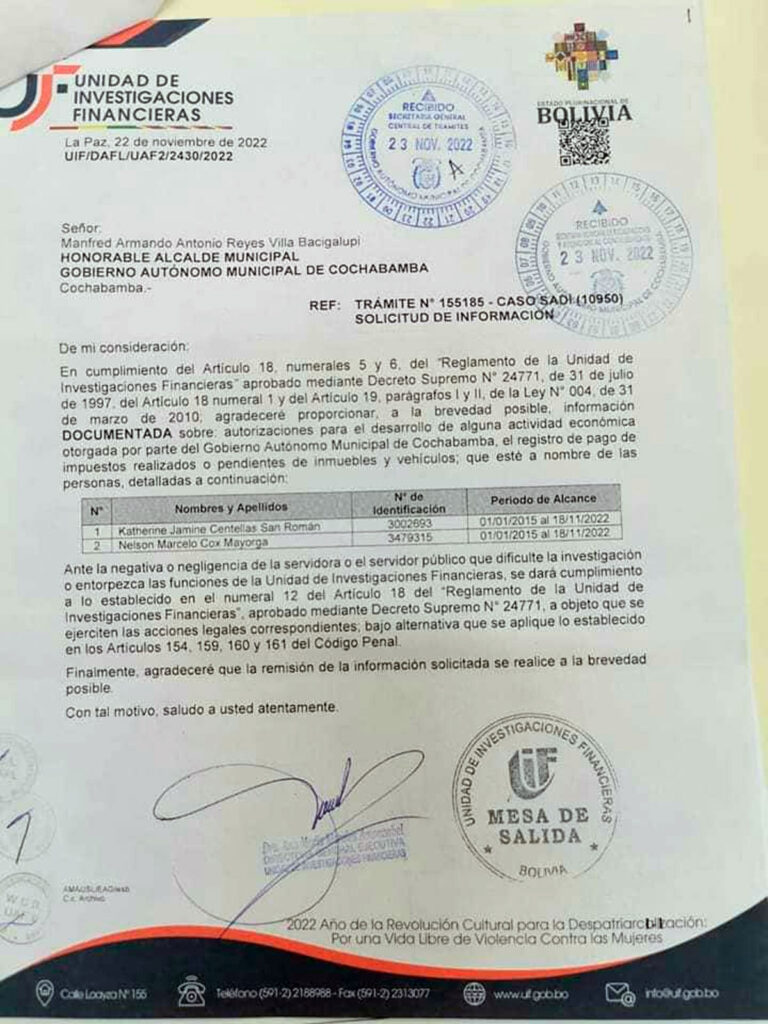 Luego de la publicación del ejecutivo, la exautoridad volvió a arremeter contra el ministro de Justicia, Iván Lima, y lo tildó de mesista, infiltrado y oportunista posteando en sus redes sociales un documento donde ratificaría que instruyeron a la Unidad de Investigaciones Financieras (UIF) mediante la Alcaldía de Cochabamba para que se le investigue.
