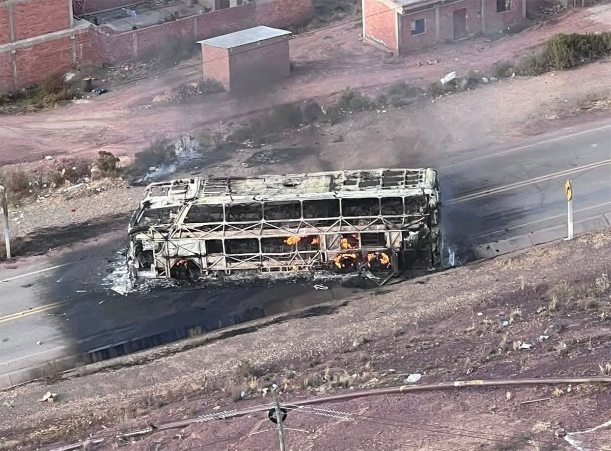 En ese contexto, el comandante departamental de la Policía de Oruro, Gonzalo Torrico, informó que además del bus, varios vehículos oficiales fueron dañados.
