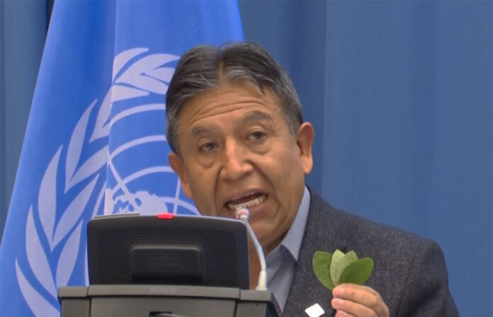 “Clasificar hace seis décadas a la hoja de coca natural como un narcótico fue un error y un engaño para monopolizar su industrialización en bebidas energizantes y fármacos sin desterrar el destino de la hoja de coca para la droga, para la expansión del delito, para matar y para ganancias sucias”, manifestó Choquehuanca.
