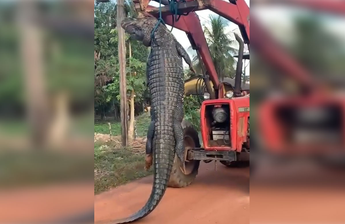 En las redes sociales circula un video donde se observa un caimán negro sin vida, de al menos cuatro metros de largo, colgado del cuello en un tractor que circula por las calles de la región de Madgalena.