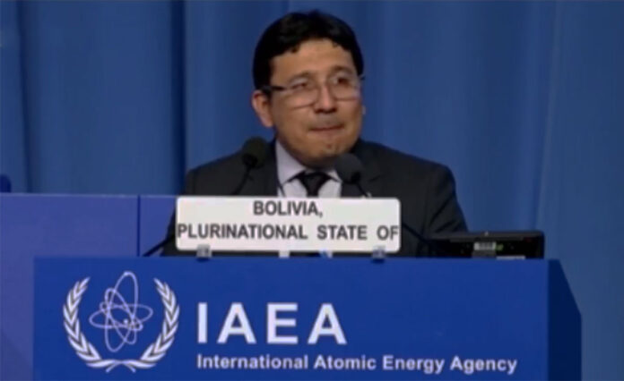 El ministro de Hidrocarburos y Energías, Franklin Molina, presentó este lunes en Viena, Austria, los avances del Programa Nuclear Boliviano, en la Sexagésima Séptima Reunión Ordinaria de la Conferencia General del Organismo Internacional de Energía Atómica (OIEA).
