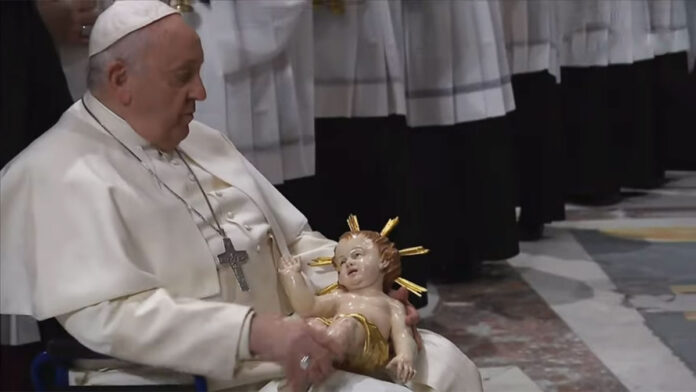 Miremos, por tanto, al «Dios vivo y verdadero» (1 Ts 1,9); a Él, que está más allá de todo cálculo humano y, sin embargo, se deja censar por nuestros cómputos; a Él, que revoluciona la historia habitándola; a Él, que nos respeta hasta el punto de permitirnos rechazarlo; a Él, que borra el pecado cargándolo sobre sí, que no quita el dolor, sino que lo transforma; que no elimina los problemas de nuestra vida, sino que da a nuestras vidas una esperanza más grande que los problemas. Desea tanto abrazar nuestra existencia que, siendo infinito, por nosotros se hace finito; siendo grande, se hace pequeño; siendo justo, vive nuestras injusticias. Este es el asombro de la Navidad: no una mezcla de afectos melosos y de consuelos mundanos, sino la inaudita ternura de Dios que salva el mundo encarnándose. Miremos al Niño, miremos su cuna, contemplemos el pesebre, que los ángeles llaman la «señal» (Lc 2,12). Es, en efecto, el signo que revela el rostro de Dios, que es compasión y misericordia, omnipotente siempre y sólo en el amor.