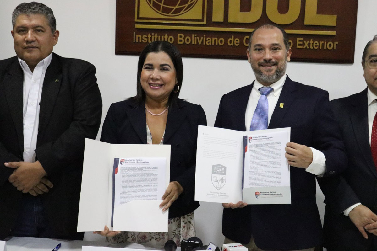 Con la finalidad de sumar capacidades en beneficio del progreso económico, en general, y académico, en particular, el Instituto Boliviano de Comercio Exterior (IBCE) y la Facultad de Ciencias Económicas y Empresariales (FCEE) de la Universidad Autónoma Gabriel René Moreno (UAGRM), suscribieron un importante Convenio Interinstitucional estableciendo la realización de varias acciones a corto plazo.