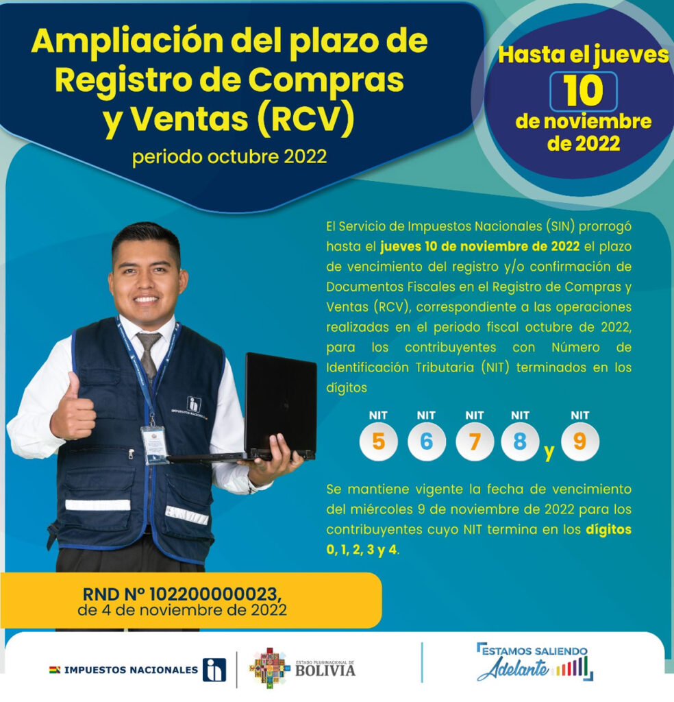 El Servicio de Impuestos Nacionales (SIN) prorrogó hasta el 10 de noviembre el plazo de vencimiento del registro y confirmación de Documentos Fiscales en el Registro de Compras y Ventas (RCV), correspondiente a las operaciones en el periodo fiscal octubre, para los contribuyentes con Número de Identificación Tributaria (NIT) terminados en los dígitos 5, 6, 7, 8 y 9.
