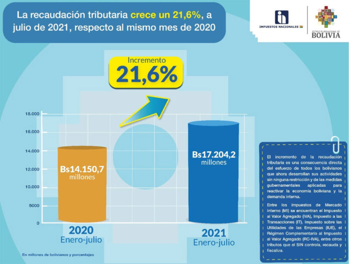 El efecto de las medidas del Gobierno nacional para reactivar la economía boliviana y restituir el Modelo Económico Social Comunitario Productivo, se refleja en el crecimiento de un 21,6% de la recaudación de Mercado Interno (MI), entre enero y julio de este año, respecto al mismo periodo de 2020, informó este sábado el Servicio de Impuestos Nacionales (SIN).