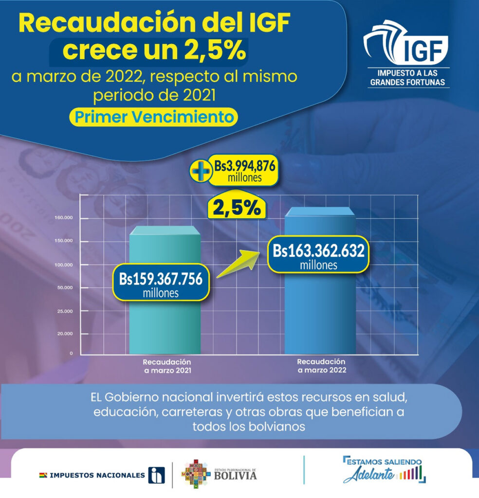 Indicó que esta recaudación corresponde a las personas naturales residentes en el país, con una fortuna neta acumulada situada o colocada en el territorio nacional y/o en el exterior mayor de Bs 30 millones, que tenían plazo hasta el 31 de marzo de 2022 para declarar y pagar el IGF.