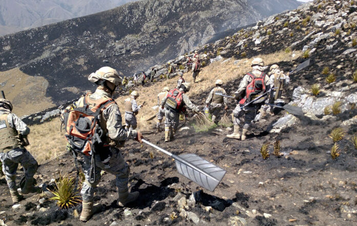 En Quime, ubicado al sudeste de La Paz, el equipo de primera respuesta realiza un trabajo de enfriamiento para evitar que el fuego se reactive.