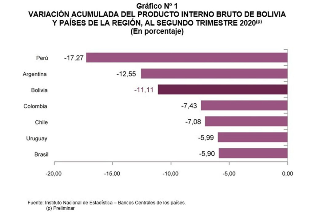 “Esta es una recuperación que va en línea con la proyección del PIB para 2020 realizada por el Banco Central de Bolivia, de -6,2% (en un rango entre -7,9% y -5,1%), así como por CEPAL (-5,2%) y el Banco Mundial (-7,3%)”, detalló el Instituto Nacional de estadística (INE) en un informe publicado esta semana.
