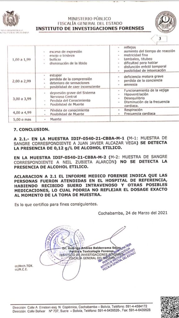 Un informe elaborado por el Instituto de Investigación Forense (IDIF) detectó la presencia de 0.12 g/l de alcohol etílico en la sangre de Juan J. A. V., el copiloto de la aeronave de la Fuerza Aérea Boliviana (FAB) que se estrelló el miércoles en Sacaba, Cochabamba.