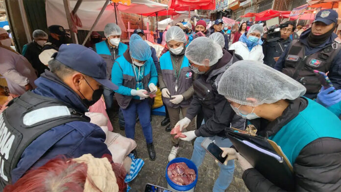 “Estamos con el operativo de control de carne de cerdo movilizados con todo el equipo de la Intendencia, con el apoyo de Guardia Municipal. Ya hemos sufrido una agresión justamente aquí a media cuadra (en la calle Munaypata) porque hemos encontrado un producto que estaban al ras del suelo, sin plástico, sin la protección necesaria y eso puede contaminar el producto”, manifestó Saavedra.