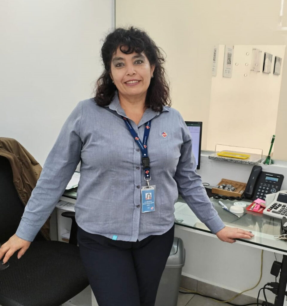 Mirtha Roxana Palacios lleva 38 años trabajando en diferentes áreas de INTI en Cochabamba. Actualmente es cajera en la oficina y antes de ingresar a la empresa trabajó en la banca. Ella recuerda que cuando empezó como secretaria en INTI el uniforme era un guardapolvo blanco y cuando ingresaban las personas le decían a ella y sus colegas “doctoritas”, creyendo que eran bioquímicas farmacéuticas.