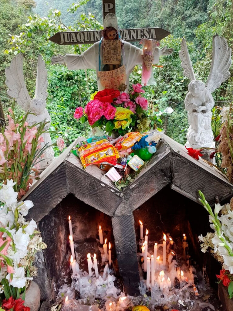 ¿Velas ardiendo? Sí, también flores, dulces, frutas, juguetes y tres representaciones religiosas hechas de yeso: Jesús y dos ángeles a los costados. Un camión de alto tonelaje se estaciona en el lugar y el conductor sale junto a su acompañante trayendo consigo más flores y un par de envases que contienen algunas bebidas.