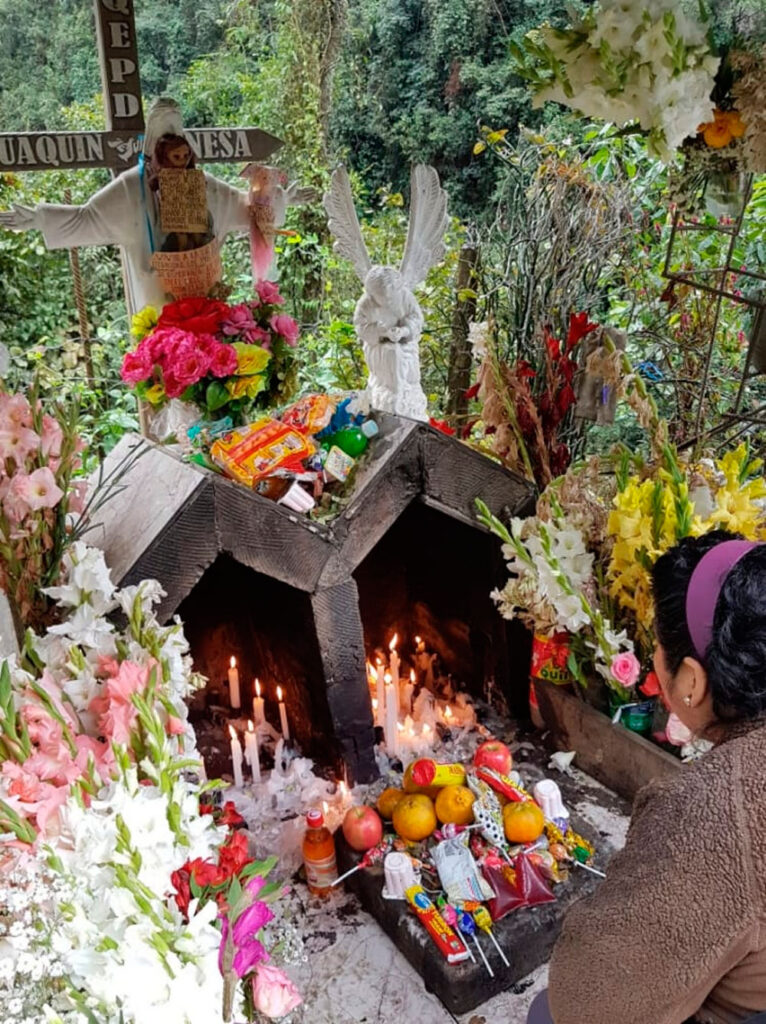 Hay dos nichos arreglados con cubiertas, techo, cerco y un pequeño espacio para sentarse, edificados con concreto. Una cruz reza los nombres de Joaquín y Vanesa. La pareja se acerca y después de hacer una oración y ofrecer los regalos, se aprestan para retirarse, es ahí donde se les pregunta sobre el altar.