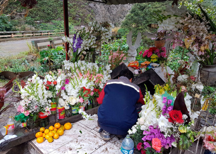 ¿Velas ardiendo? Sí, también flores, dulces, frutas, juguetes y tres representaciones religiosas hechas de yeso: Jesús y dos ángeles a los costados. Un camión de alto tonelaje se estaciona en el lugar y el conductor sale junto a su acompañante trayendo consigo más flores y un par de envases que contienen algunas bebidas.