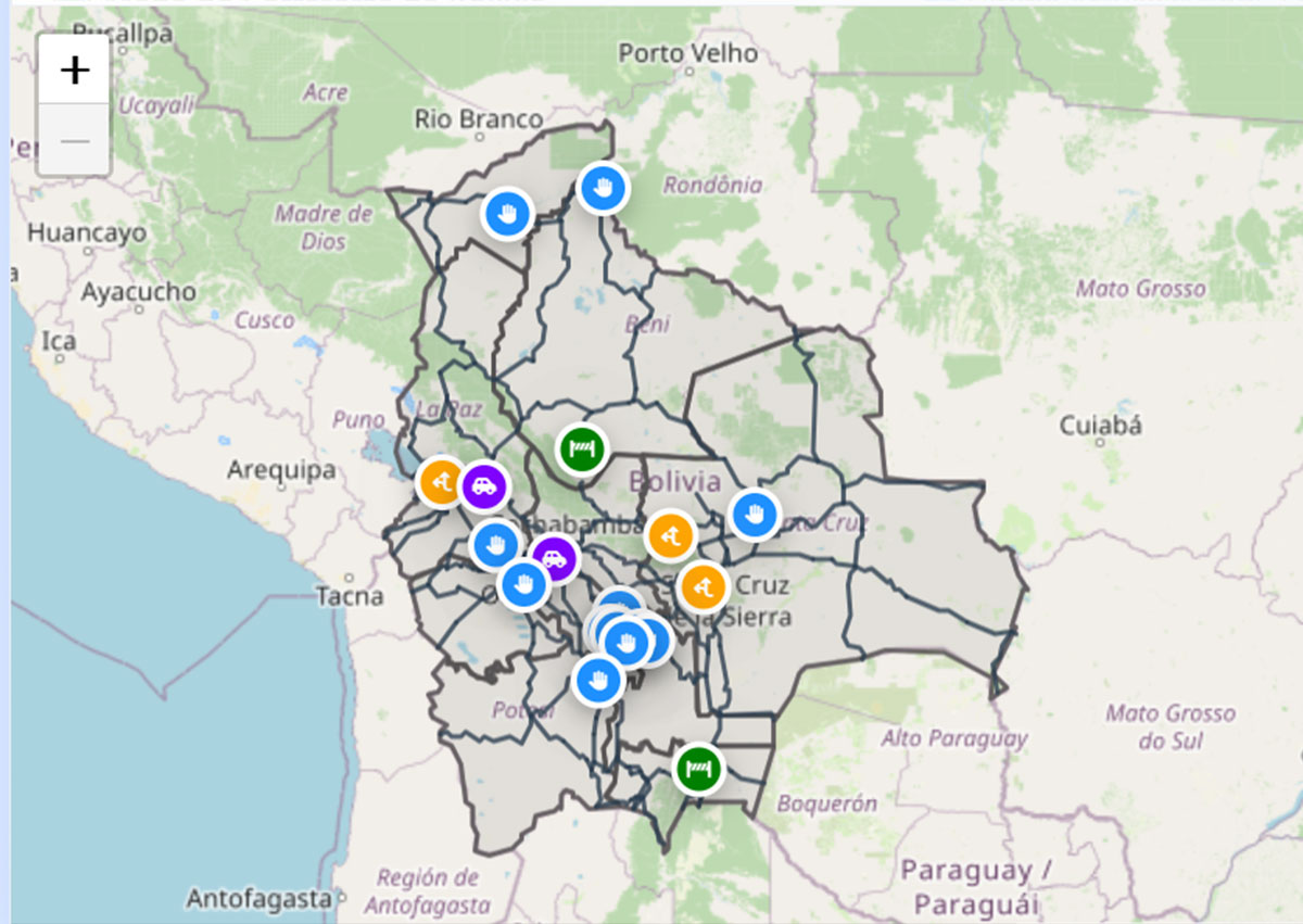 De acuerdo con el reporte oficial de transitabilidad (https://transitabilidad.abc.gob.bo/), Chuquisaca concentró la mayor cantidad de bloqueos con seis puntos, mientras que La Paz, Santa Cruz, Oruro, Potosí, Beni y Pando registraron un punto de corte cada uno.