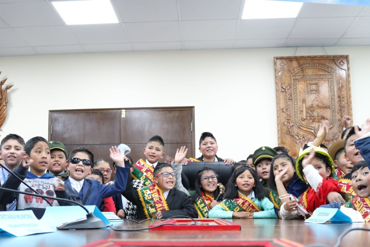 Recordando el Día del Niño Boliviano, la Alcaldía de El Alto realizó este martes la reunión del “Ch’iti Gabinete”, donde los pequeños representando a sus distritos asumieron como secretarios municipales, subalcaldes y Alcaldesa por un día.