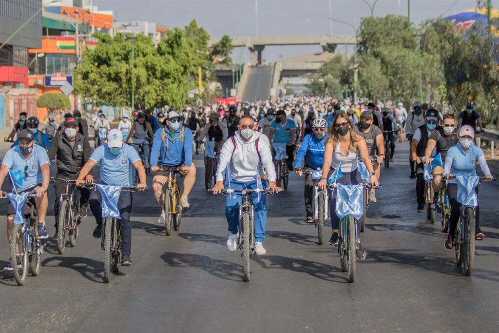 Al promediar las 8.00 de este domingo y a la cabeza del alcalde Suplente Manfred Reyes Villa Avilés, la caravana ciclística partió del distribuidor de la Av. Beijing hasta la plaza de las Banderas; donde realizaron un acto central y socializaron la importancia del Día del Peatón.