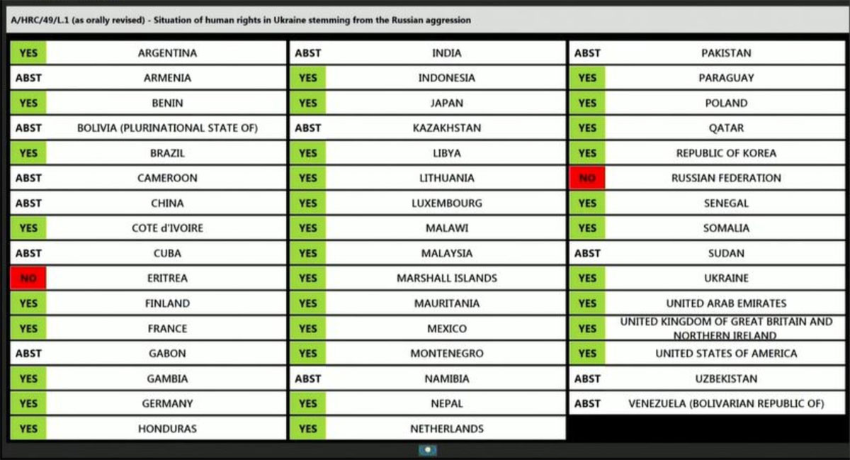 El Consejo de Derechos Humanos de la ONU aprobó este viernes una resolución por la cual se creará una comisión independiente de tres expertos para investigar las violaciones de DD. HH. perpetradas por Rusia en su agresión a Ucrania, que según Kiev constituyen crímenes de guerra y contra la humanidad.