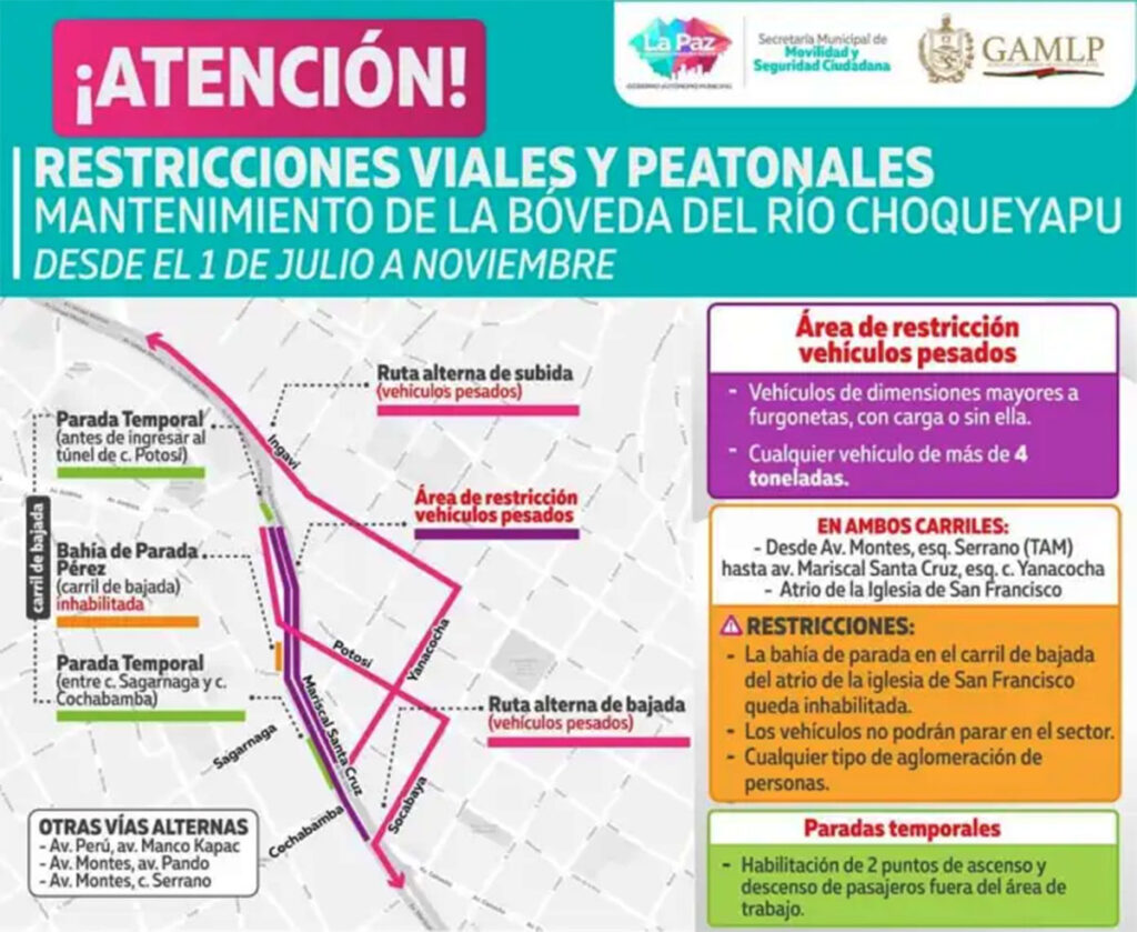 Con el fin de precautelar la bóveda del río Choqueyapu, la Alcaldía de La Paz aplicará restricciones en inmediaciones de la plaza San Francisco desde el 1 de julio. Por lo que no podrán ingresar vehículos pesados, tampoco habrá paradas de autos y no se permitirá ningún tipo de aglomeración.