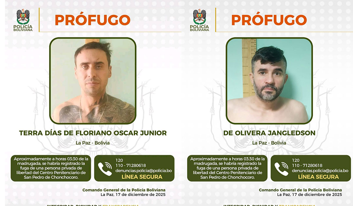 Un oficial de la Policía Boliviana ha sido aprehendido tras la fuga de dos reclusos de nacionalidad brasileña del recinto penitenciario de máxima seguridad de Chonchocoro. El uniformado, cuya identidad no ha sido revelada, se encontraba bajo custodia de la torre de vigilancia en el sector desde donde los internos lograron evadir el perímetro.