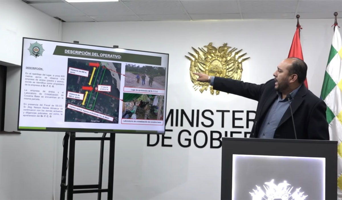El ministro de Gobierno, Roberto Ríos, informó que el laboratorio de cristalización de cocaína descubierto en un terreno del exviceministro de Defensa Social, Felipe Cáceres, tenía la capacidad de producir entre 150 y 160 kilos de clorhidrato de cocaína al día.