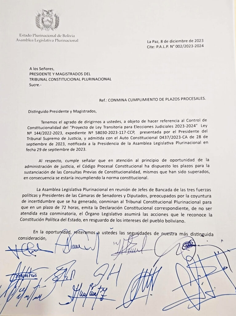 “La Asamblea Legislativa Plurinacional en reunión de jefes de bancada de las tres fuerzas políticas y presidentes de las Cámaras de Senadores y Diputados, preocupados por la coyuntura de incertidumbre que se ha generado, conminan al Tribunal Constitucional Plurinacional para que, en un plazo de 72 horas, emita la Declaración Constitucional correspondiente del Proyecto de Ley Transitoria para Elecciones Judiciales 2023-2024, Ley Nº 144/2022-20232”, cita parte de la nota enviada al presidente y Magistrados del Tribunal Constitucional Plurinacional.