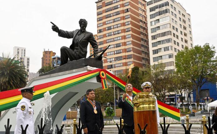 Acompañado de autoridades nacionales, el presidente Luis Arce Catacora inició este viernes los actos en conmemoración al 145 aniversario de la heroica Defensa de Calama y el Día del Mar con una ofrenda floral a los pies del monumento de Eduardo Abaroa, en la plaza del mismo nombre, en la ciudad de La Paz.