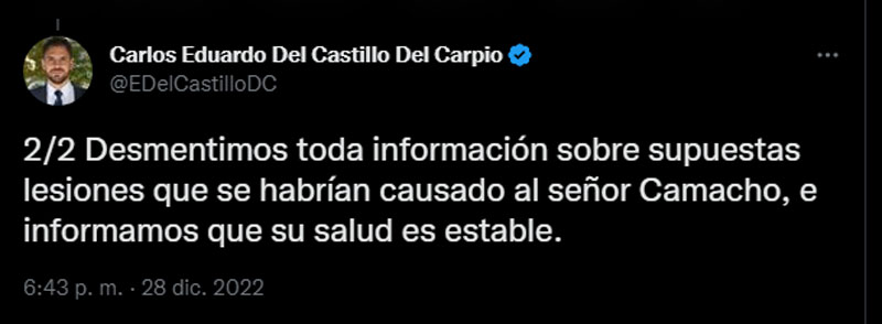 Por su parte, el ministro de Gobierno, Eduardo del Castillo, informó en su cuenta de Twitter que Camacho no sufrió ninguna lesión al momento de su aprehensión y aseguró que sus derechos constitucionales y derechos humanos fueron respetados en todo momento.