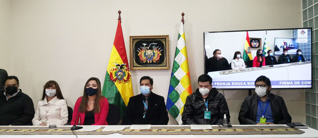 El ministro de Educación, Adrián Quelca, la viceministra de Comunicación, Gabriela Alcón, y los directores de los medios de comunicación estatales firmaron este viernes un convenio para la implementación de un sistema de enseñanza a distancia, que se impartirán desde el 1 de febrero, una vez se inaugure el año escolar.