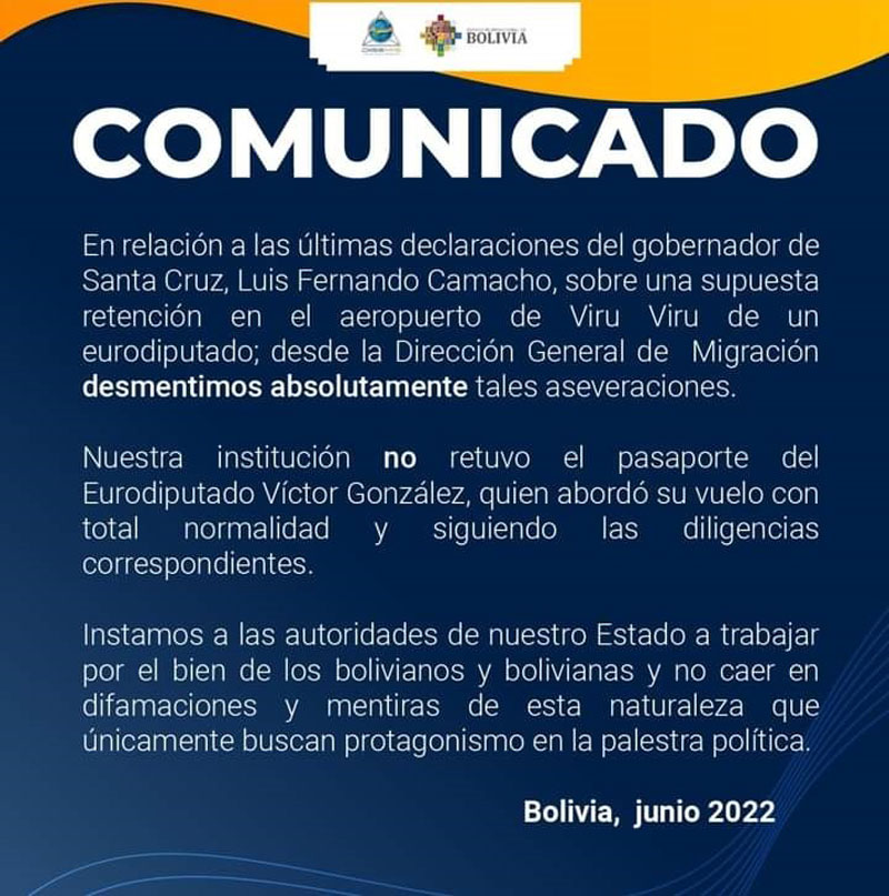 “En relación a las últimas declaraciones del gobernador de Santa Cruz, Luis Fernando Camacho, sobre una supuesta retención en el aeropuerto de Viru Viru de un eurodiputado, desde la Dirección General de Migración desmentimos absolutamente tales aseveraciones”, afirmó Migración a través de un comunicado.