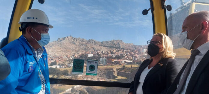 El Gerente Ejecutivo de Mi Teleférico, Sergio Choque, recibió a la Ministra Federal de Cooperación Económica y Desarrollo de Alemania, Svenja Schulze, y la acompañó en un tour hacia El Alto desde la zona Sur en las Línea Amarilla y Plateada de esta empresa.