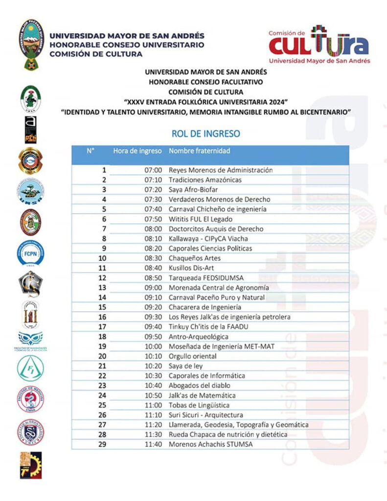 También indicaron que este fin de semana se realiza la Pre Entrada Universitaria en la zona de Miraflores. Comenzará en la plaza Villarroel y terminará en la plaza San Martín. El siguiente sábado, 27 de julio será la entrada, donde participarán 80 fraternidades.
