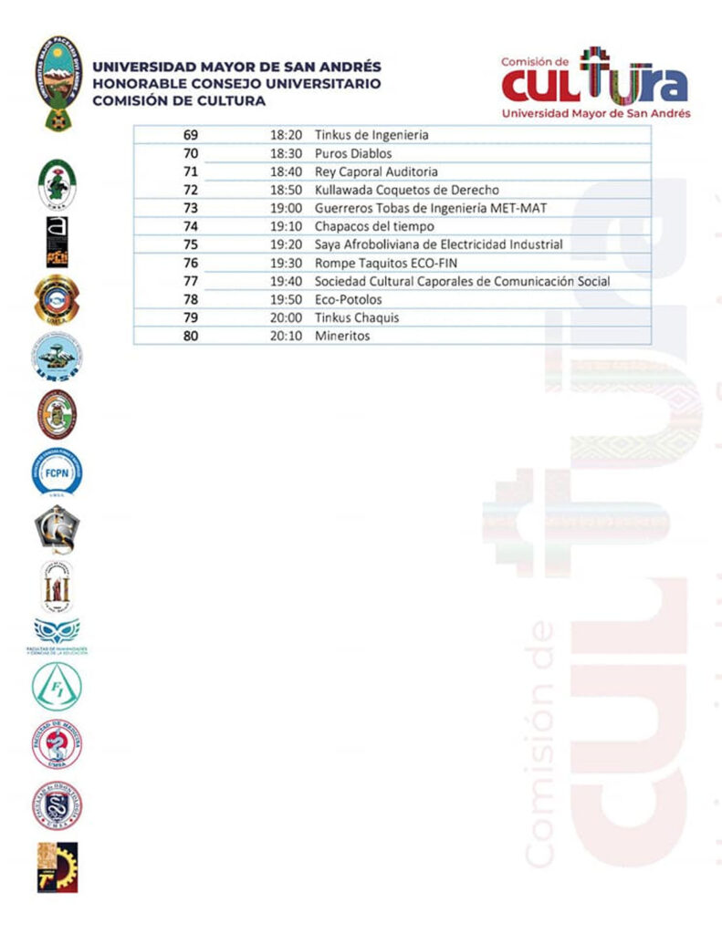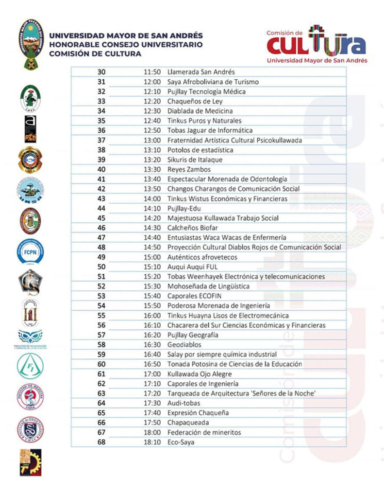 “Partiríamos de la avenida Arce, frente a la Facultad Técnica y Tecnología, subiríamos por El Prado, llegamos a la avenida Camacho, luego entramos la avenida, para arribar hasta la Simón Bolívar. Esa sería la modificación sustancial”, precisó Virginia Ferrufino, presidenta de la Comisión de Cultura de la UMSA.