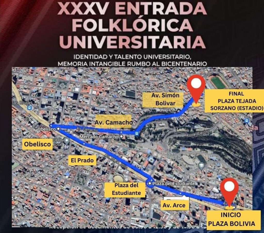 Autoridades de la Universidad Mayor de San Andrés (UMSA) y la Alcaldía de La Paz, debido a los daños en las bóvedas del río Choqueyapu, modificaron la ruta de la Entrada Universitaria de la siguiente manera: comenzará en la avenida Arce, subirá por el Prado, Obelisco, Camacho y culminará en la avenida Simón Bolívar.