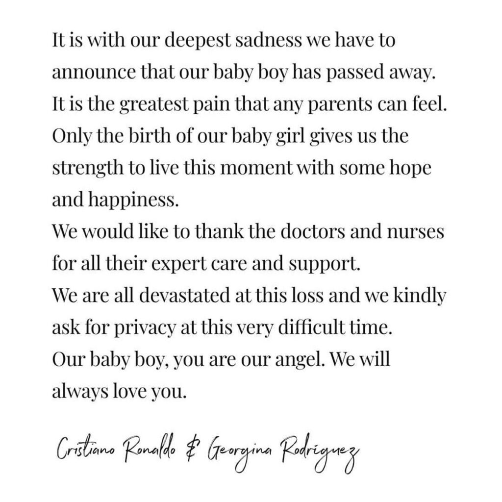 Este lunes, Cristiano Ronaldo y Georgina Rodríguez anunciaron la triste nueva de que uno de los bebés que esperaban había fallecido. La pareja, que había compartido hace unos meses que iban a convertirse en padres de mellizos, niño y niña, se manifestaron esta vez para dar el adiós al niño varón que no se pudo quedar con ellos.
