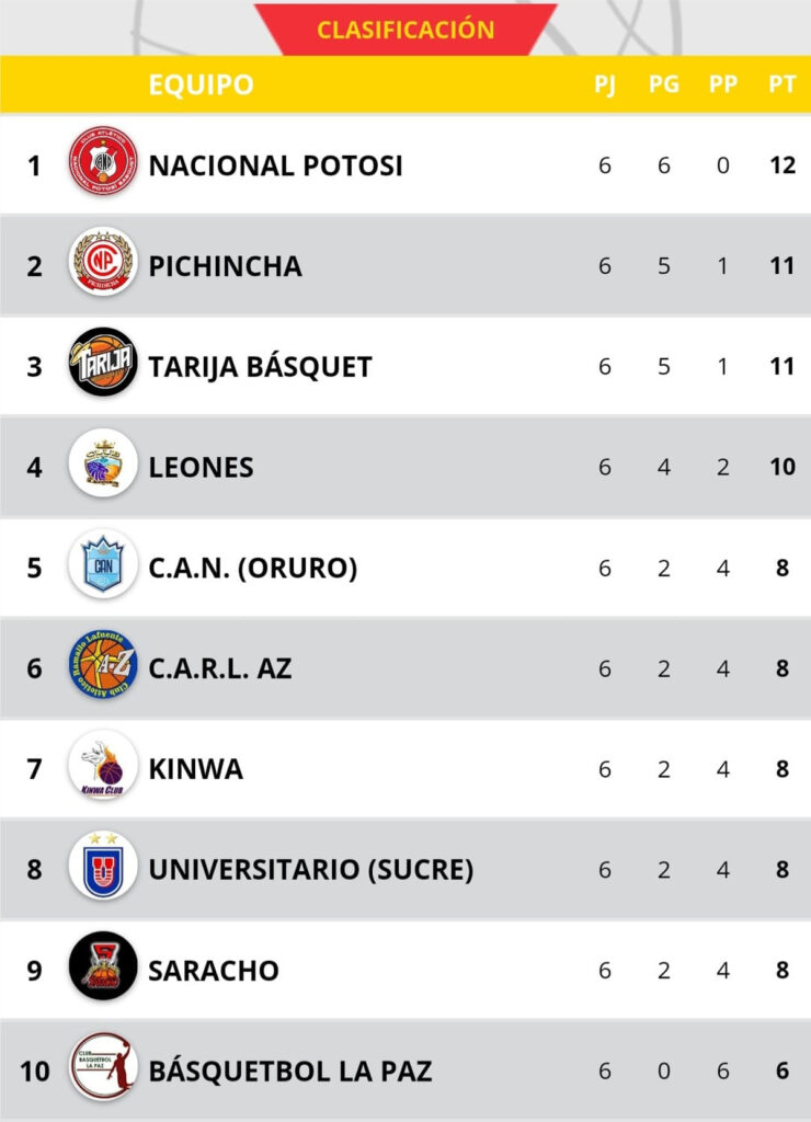 Nacional Potosí es el único club invicto en la Liga Boliviana de Básquetbol (Libobásquet) masculina y se mantiene como líder con 12 puntos tras la sexta jornada que terminó de disputarse el viernes por la noche.