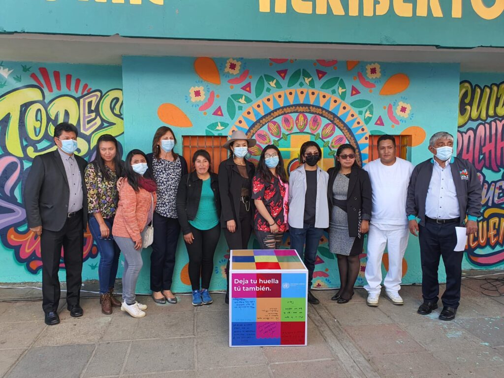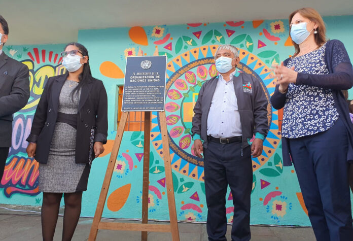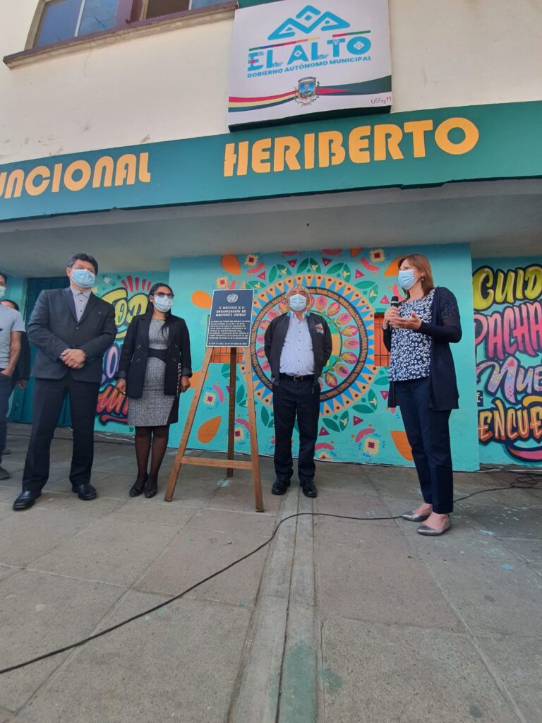 La Paz, 22 de octubre de 2021. Conmemorando su 76 aniversario en nuestro país, las Naciones Unidas en Bolivia busca generar espacios de encuentro. Para ello, jóvenes y artistas de La Paz y El Alto crearon un mural para promover la solidaridad y la inclusión a través del arte. Autoridades participantes coincidieron en mensajes de unidad y encuentro entre ambos municipios.