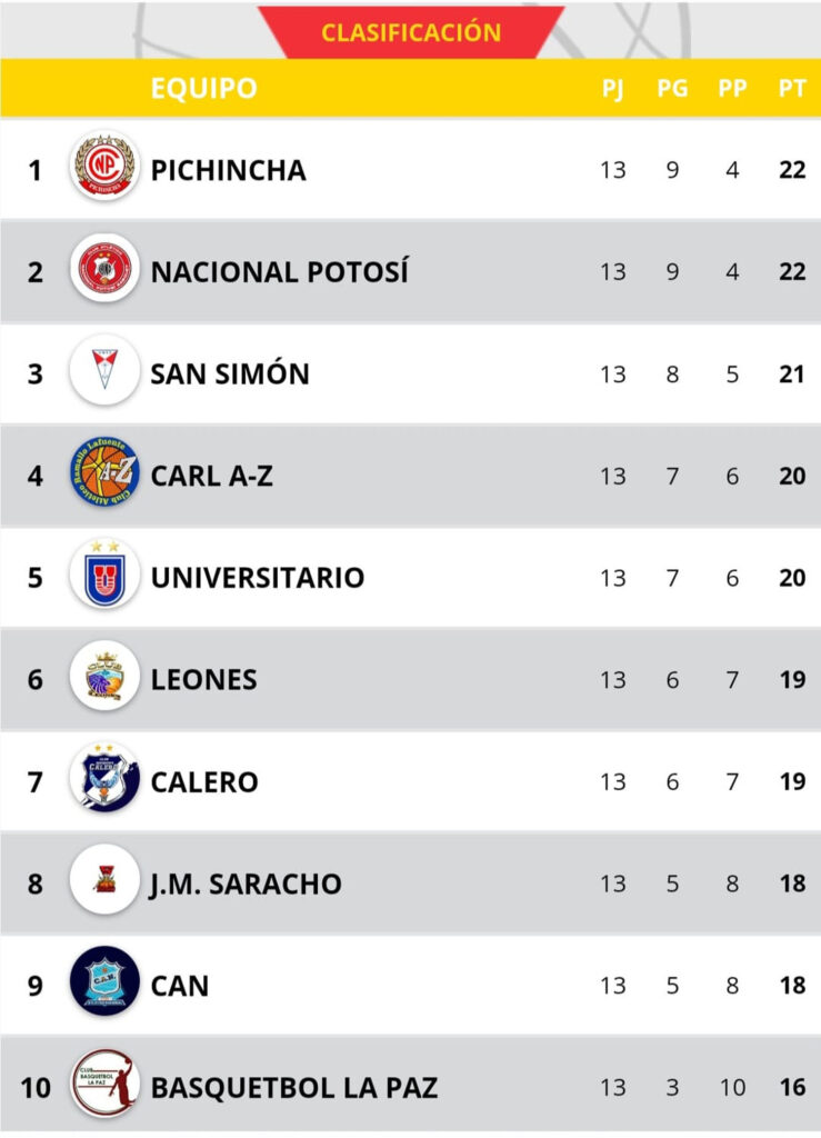 El club potosino Pichincha hizo respetar su localía al vencer al cochabambino San Simón (85-81) y volvió a la cima de la Liga Boliviana de Básquetbol (Libobásquet) masculina con Nacional Potosí (ambos con 22 puntos), que cayó ante Universitario en Sucre (81-68) en el marco de la decimotercera jornada.