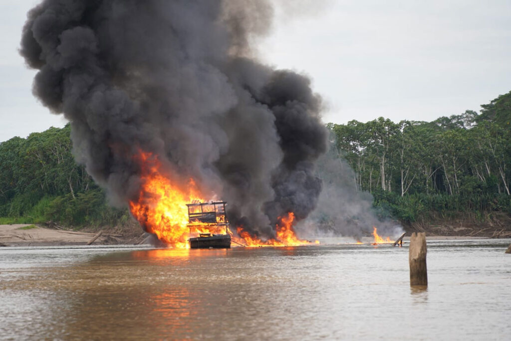 “Se ha logrado colectar más de 27 dragas que han sido destruidas de manera inmediata, hay una afectación a esta actividad ilícita de más de 1,5 millones de dólares, hay un total de 57 personas aprehendidas, 54 varones y tres mujeres”, explicó la autoridad en conferencia de prensa.