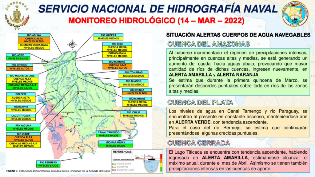 El Servicio Nacional de Hidrografía Naval de la Armada Boliviana informó este lunes que, durante la primera quincena de este mes, se prevé desbordes en ríos de la cuenca del Amazonas, ante las intensas precipitaciones.