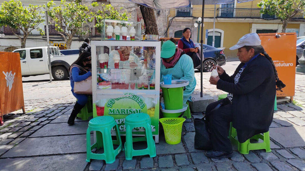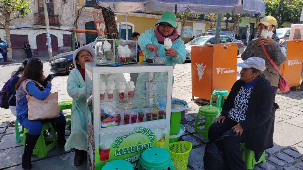 Verónica Callisaya, otra vendedora, alega que si bien hay un incremento en la cantidad de ventas, “a veces el calor también juega una mala pasada; hace que la leche no levante”. El secreto para afrontar ese obstáculo lo tienen varias: usar una lata de Gloria de Nestlé congelada y otra a temperatura ambiente; o en caso de no contar con lata del producto congelado, acuden a los cubos de hielo para que “se mantenga así como el Illimani, firme y blanquito”.