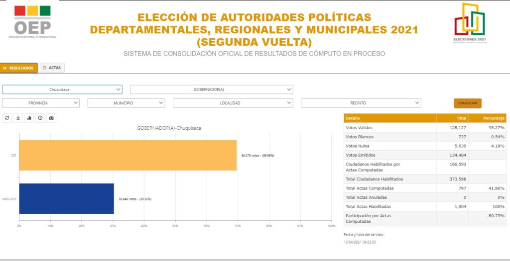 En Chuquisaca, al 39.02% del escrutinio, Damián Condori de Chuquisaca Somos Todos (CST) aparecía con el 70.93% y Juan Carlos León, del MAS, con el 29.07%.