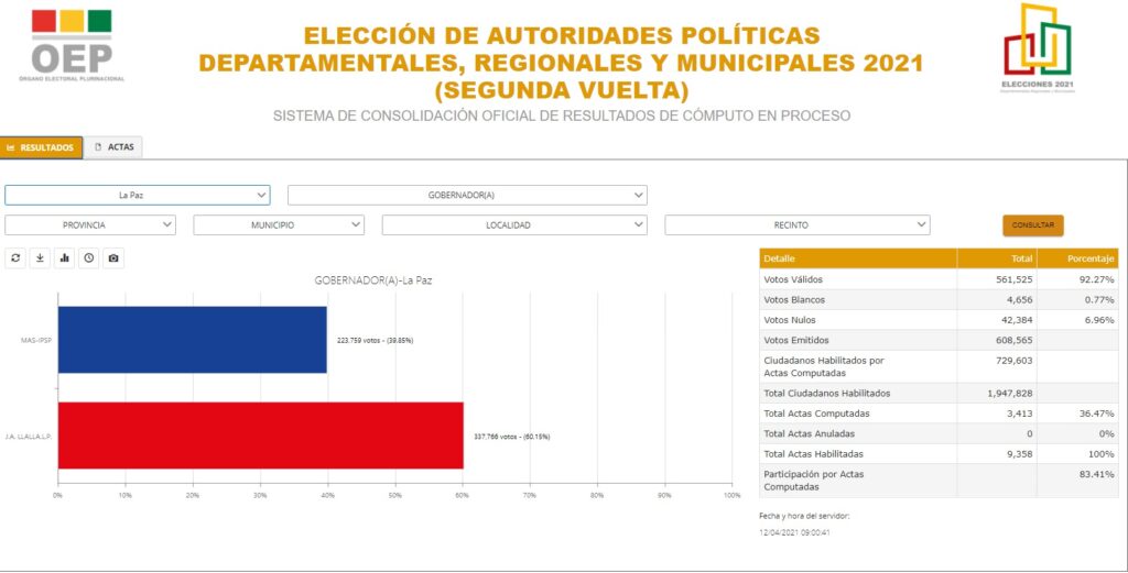 En La Paz, el escrutinio había llegado al 35.39% % y el primer lugar era ocupado por el candidato Santos Quispe, de la agrupación Jallalla, con el 60.19%. El postulante del Movimiento Al Socialismo (MAS), Franklin Flores, aparecía con el 39.81% de respaldo en urnas.