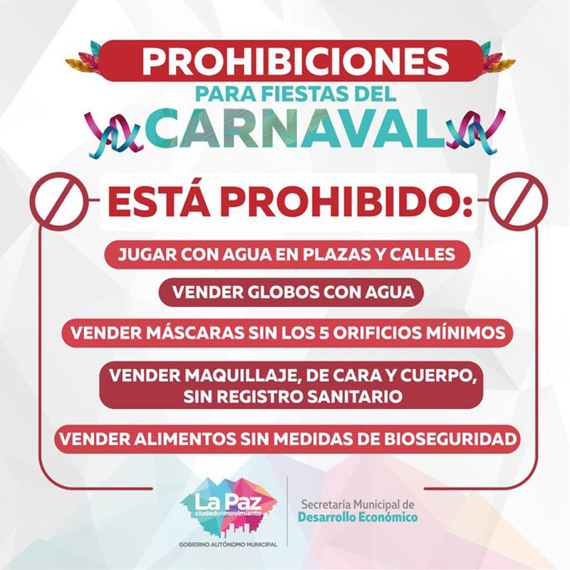 La Alcaldía de La Paz recordó este jueves, ante la proximidad de las fiestas de Carnaval, que está prohibido el juego con agua en espacios públicos. Y de igual manera no está autorizada la comercialización de máscaras que no tengan al menos cinco orificios de respiración, o que desprendan pintura.