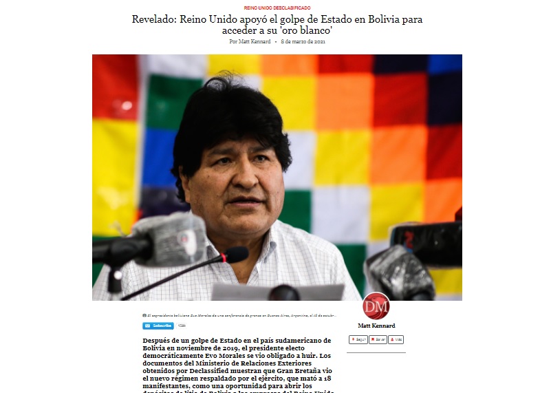 EL lunes, el portal británico Declassified UK publicó un artículo del periodista Matthew Kennard (firma como Matt Kennard) en el que se asegura que “Gran Bretaña apoyó el golpe en Bolivia para acceder a su ‘oro blanco’”, en referencia al litio.
